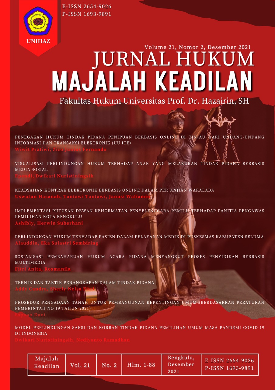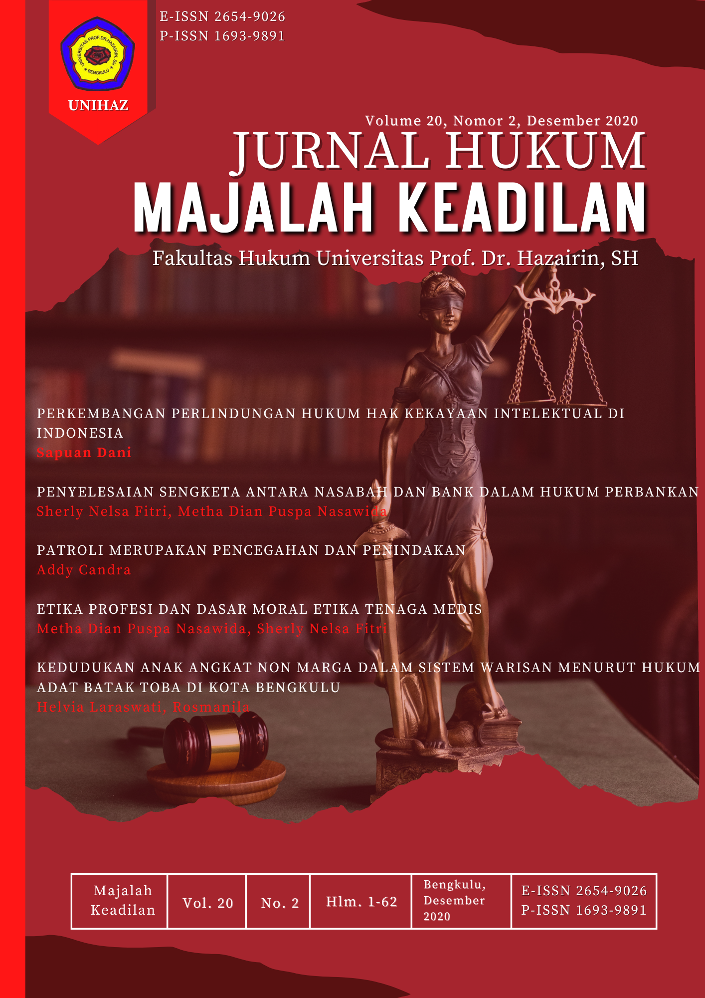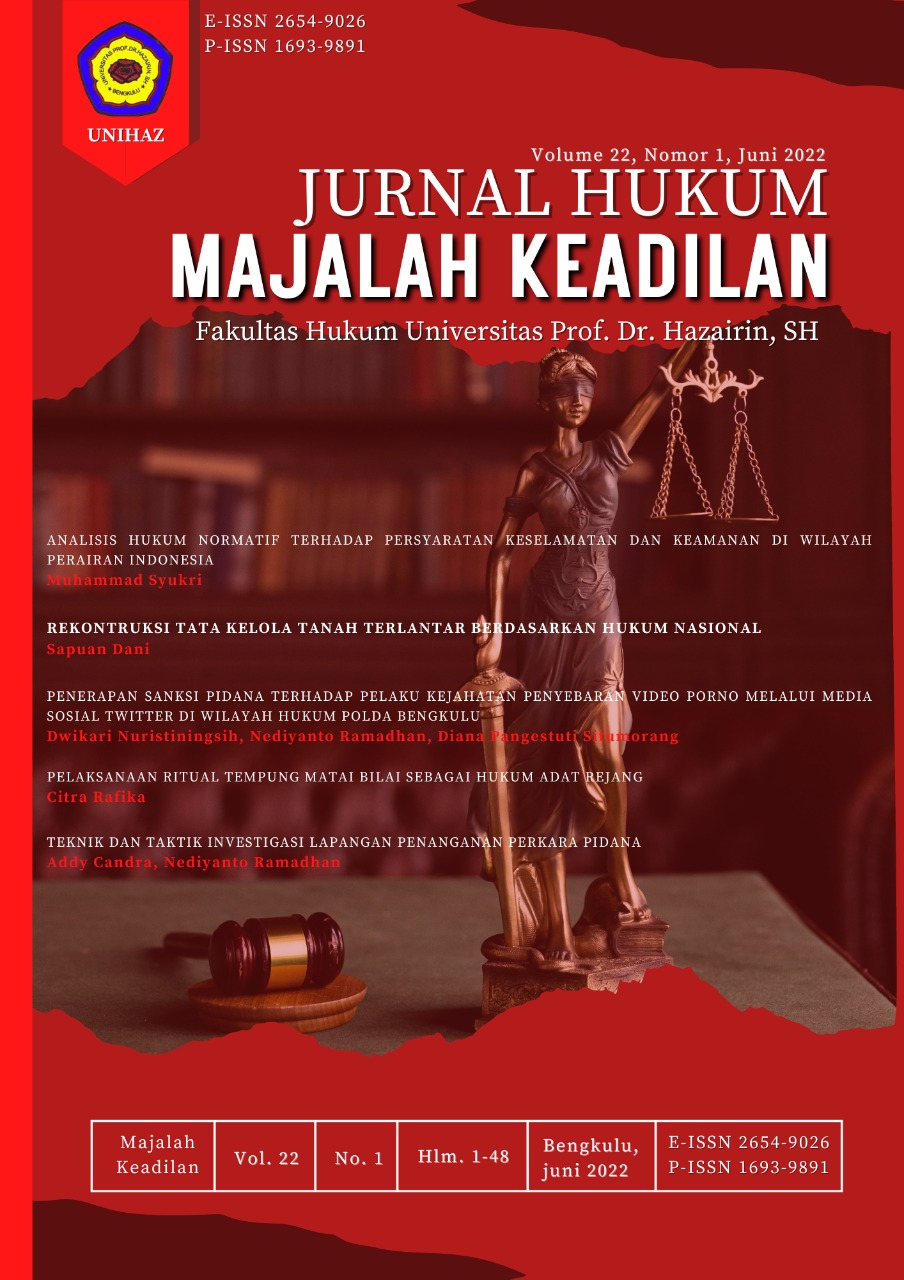 Fakultas Hukum Universitas Prof. Dr. Hazairin, SH. Jalan Jend. A. Yani No.1, Kebun Ros, Kec. Teluk Segara, Kota Bengkulu 38115, Indonesia, Telp/Fax: (0736) 342402, Handphone: 082371118060, Email: majalahkeadilanhukumunihaz@gmail.com, Website: https://journals.unihaz.ac.id/index.php/keadilan